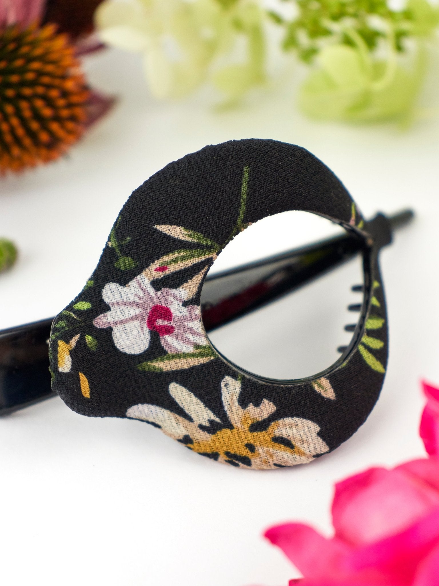 Crafted from black salvaged fabric adorned with big white flowers with yellow centers and pale pink flowers with deep pink centers and a flourish of green leaves. Each clip features a unique cut of the floral pattern, making every piece one-of-a-kind. This large hair clip not only enhances your updo with its charming design but also holds your style securely in place, making it as functional as it is fashionable.