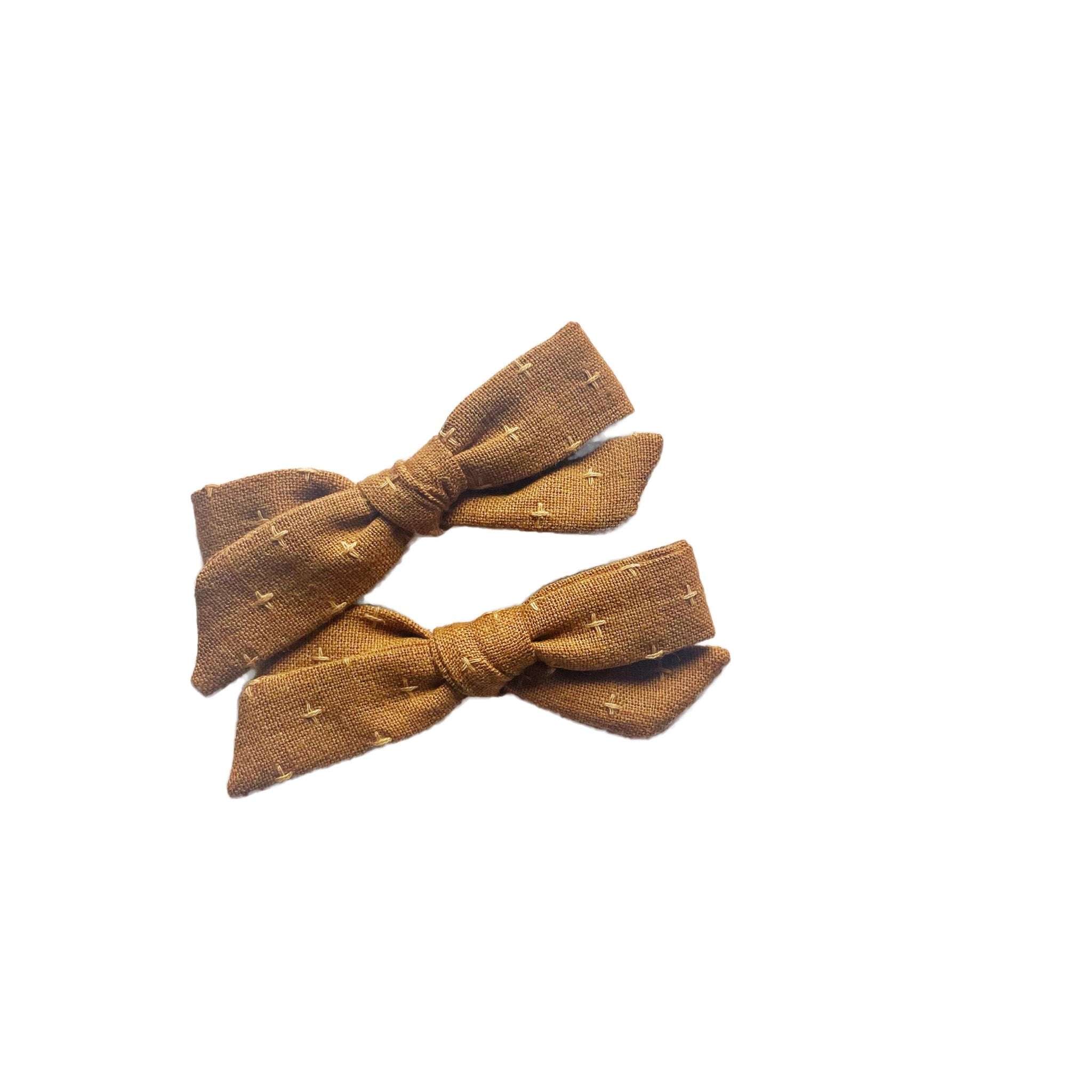 All Bows are hand-cut and sewn with love for your child. The Madison Bow is a mix between the Lincoln & Johnson Bows. Pattern placement will vary which makes each bow unique. Set comes with one left & one right clip bow.