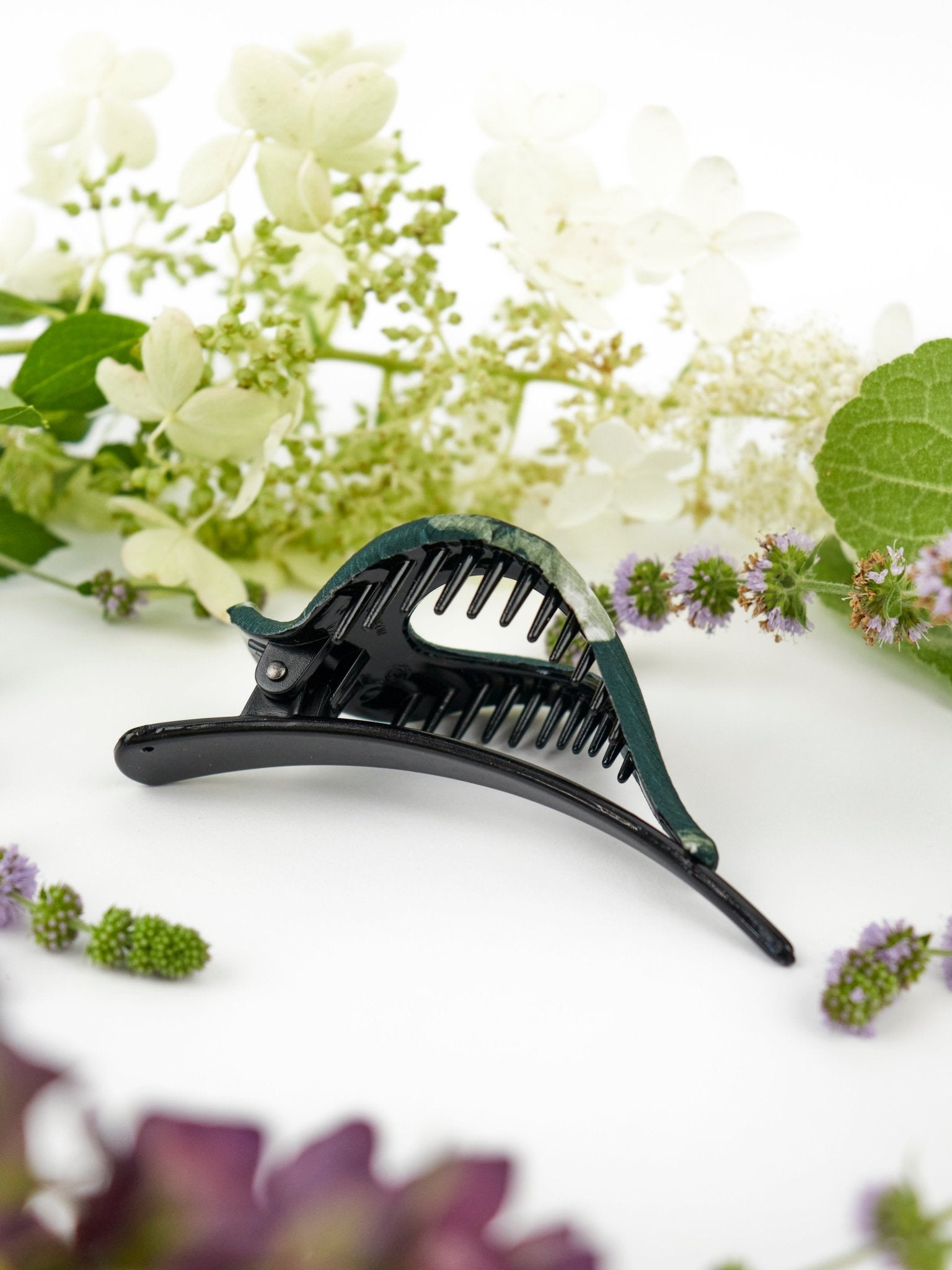 Crafted from deep green salvaged fabric adorned with white flowers and dusty green accents and leaves, each clip features a unique cut of the floral pattern, making every piece one-of-a-kind. This large hair clip not only enhances your updo with its charming design but also holds your style securely in place, making it as functional as it is fashionable.