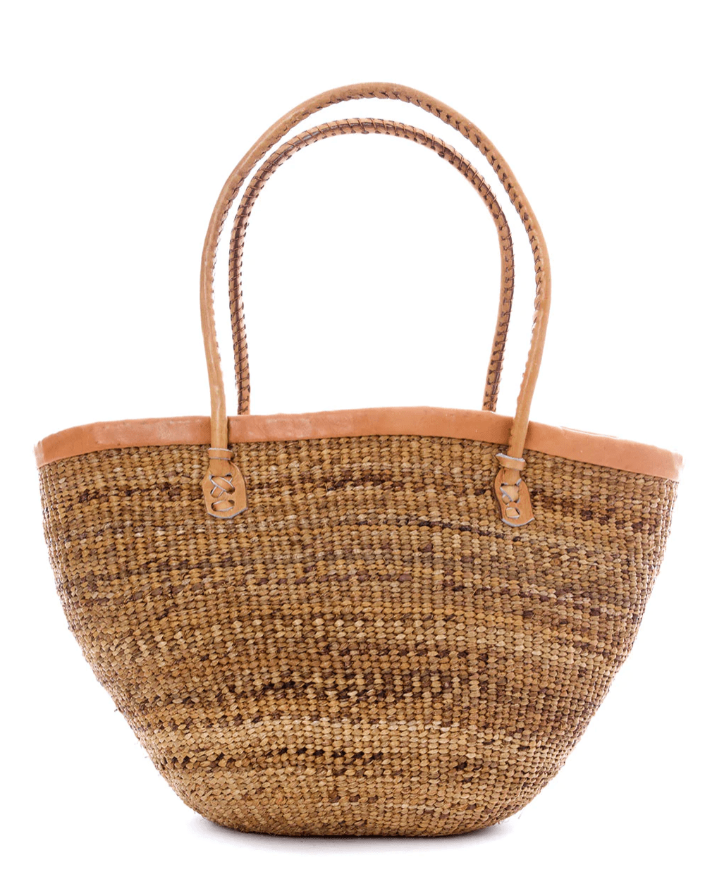 Artisans put their expert weaving skills to work to bring you this down-to-earth open top banana fiber tote bag. Woven from long strips of fiber extracted from banana palm leaves, each bag is naturally variegated, and also includes a handy flat bottom. A leather trimmed top and handles add style and durability.